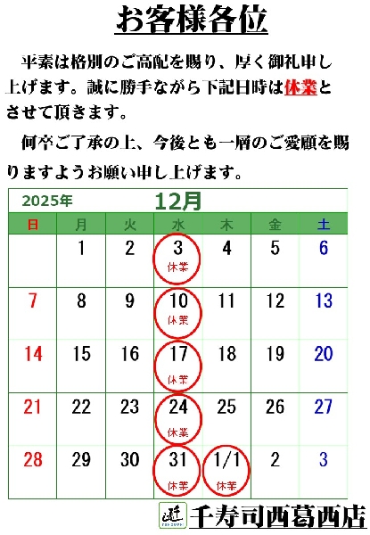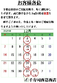 12月の臨時休業(西葛西店)