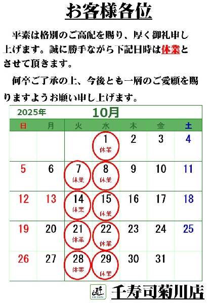 平素は格別のご高配を賜り、厚く御礼申し上げます。誠に恐れ入りますが、下記日程で臨時休業とさせていただきます。何卒ご了承の上、一層のご愛顧を賜りますようお願い申し上げます。1 (水)7 (火)8 (水)14 (火)15(水)21 (火)22(水)28 (火)29 (水)