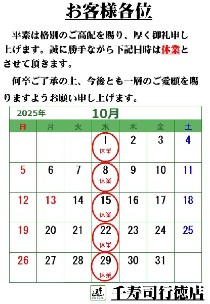 平素は格別のご高配を賜り、厚く御礼申し上げます。誠に恐れ入りますが、下記日程で臨時休業とさせていただきます。何卒ご了承の上、一層のご愛顧を賜りますようお願い申し上げます。1 (水)8 (水)15(水)22(水)29 (水)
