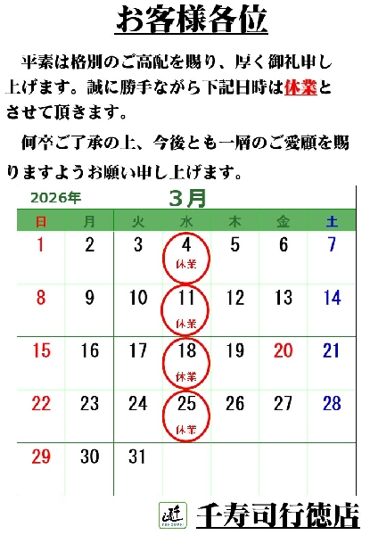 平素は格別のご高配を賜り、厚く御礼申し上げます。誠に恐れ入りますが、下記日程で臨時休業とさせていただきます。何卒ご了承の上、一層のご愛顧を賜りますようお願い申し上げます。4 (水)11(水)18(水)25(水)